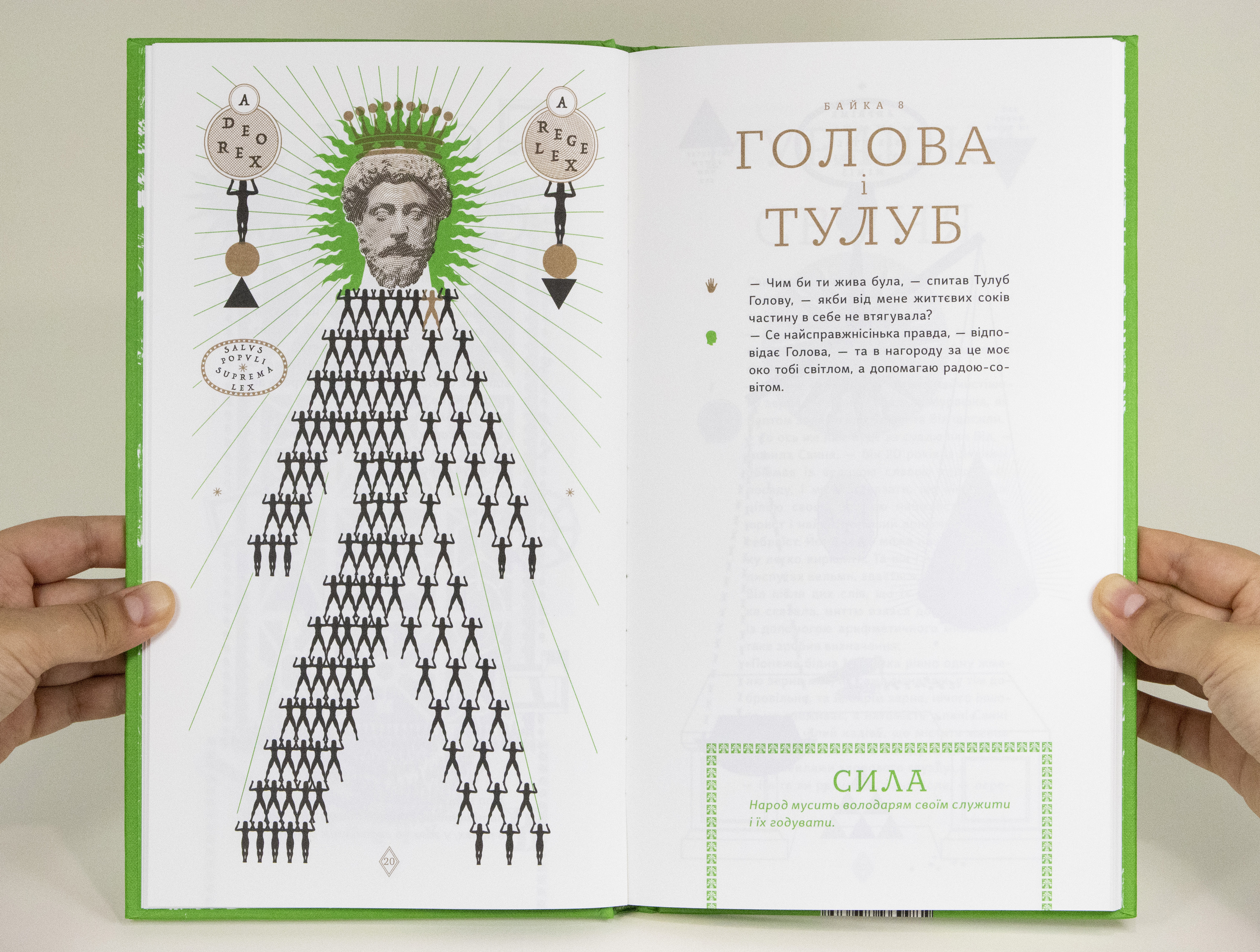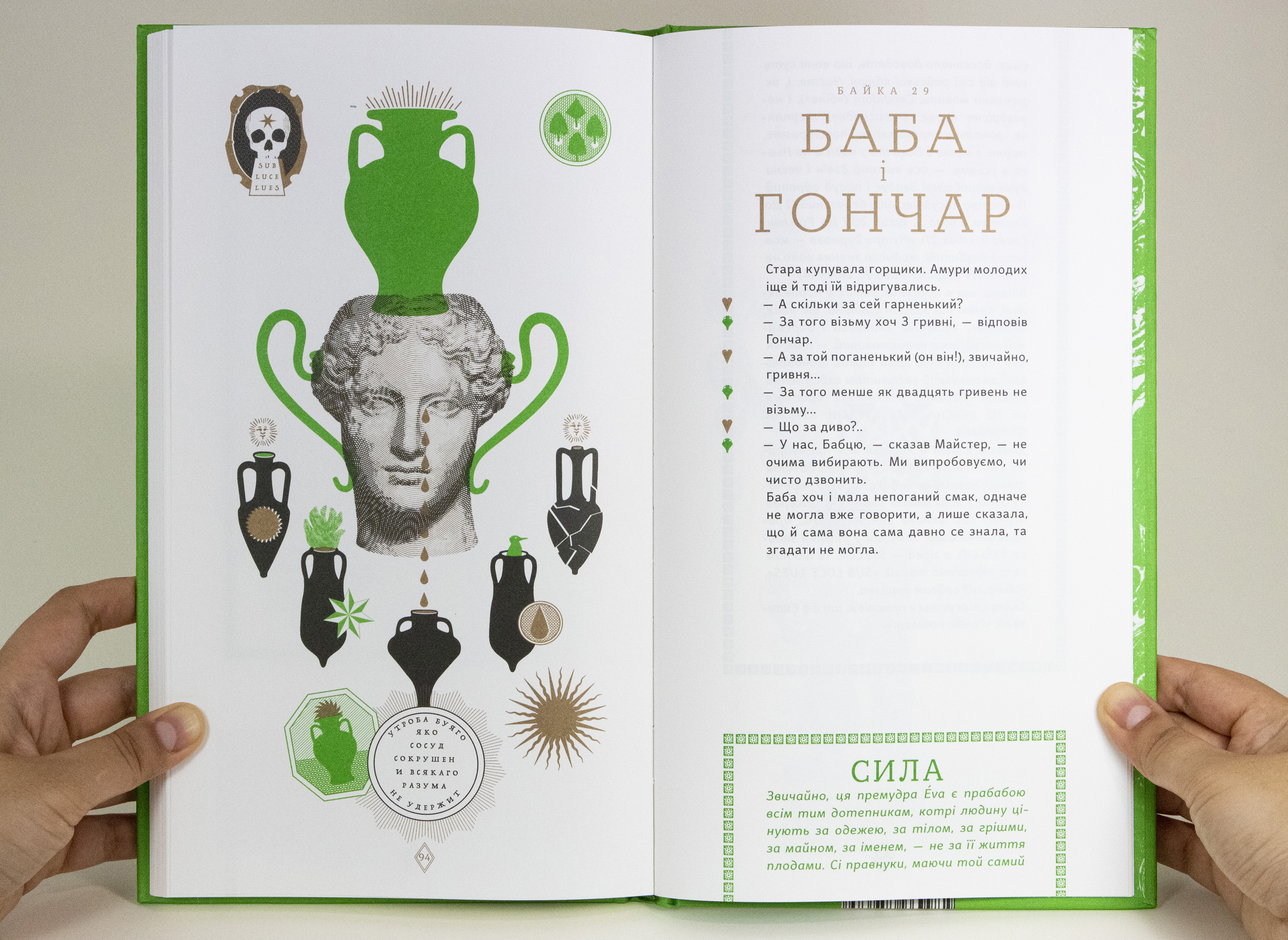 Ця книга говорить із читачем багатьма голосами та багатьма мовами. 30 байок Григорія Сковороди, написані староукраїнською мовою в 70-х роках XVIII століття, переклав сучасною українською Назар Федорак, а ми проілюстрували. Сковорода до кожного з текстів написав своє ж пояснення — «силу», — й у книзі ці «сили» посідають рівнозначне місце з байками та ілюстраціями. Читач вирушить в інтелектуальну й візуальну мандрівку крізь епохи античності та бароко до сьогодення. Ілюстрації до кожної з байок поєднують традицію та новаторство, класичні графічні техніки та сучасні експерименти. Тут давні барокові гравюри транспоновані у цифровий вимір, немовби хтось надіслав їх із минулого з допомогою бінарного коду. Кожен образ — це візуальний ребус із багатьма прихованими символами, алюзіями з Біблії, цитатами автора і латинськими прислів’ями.