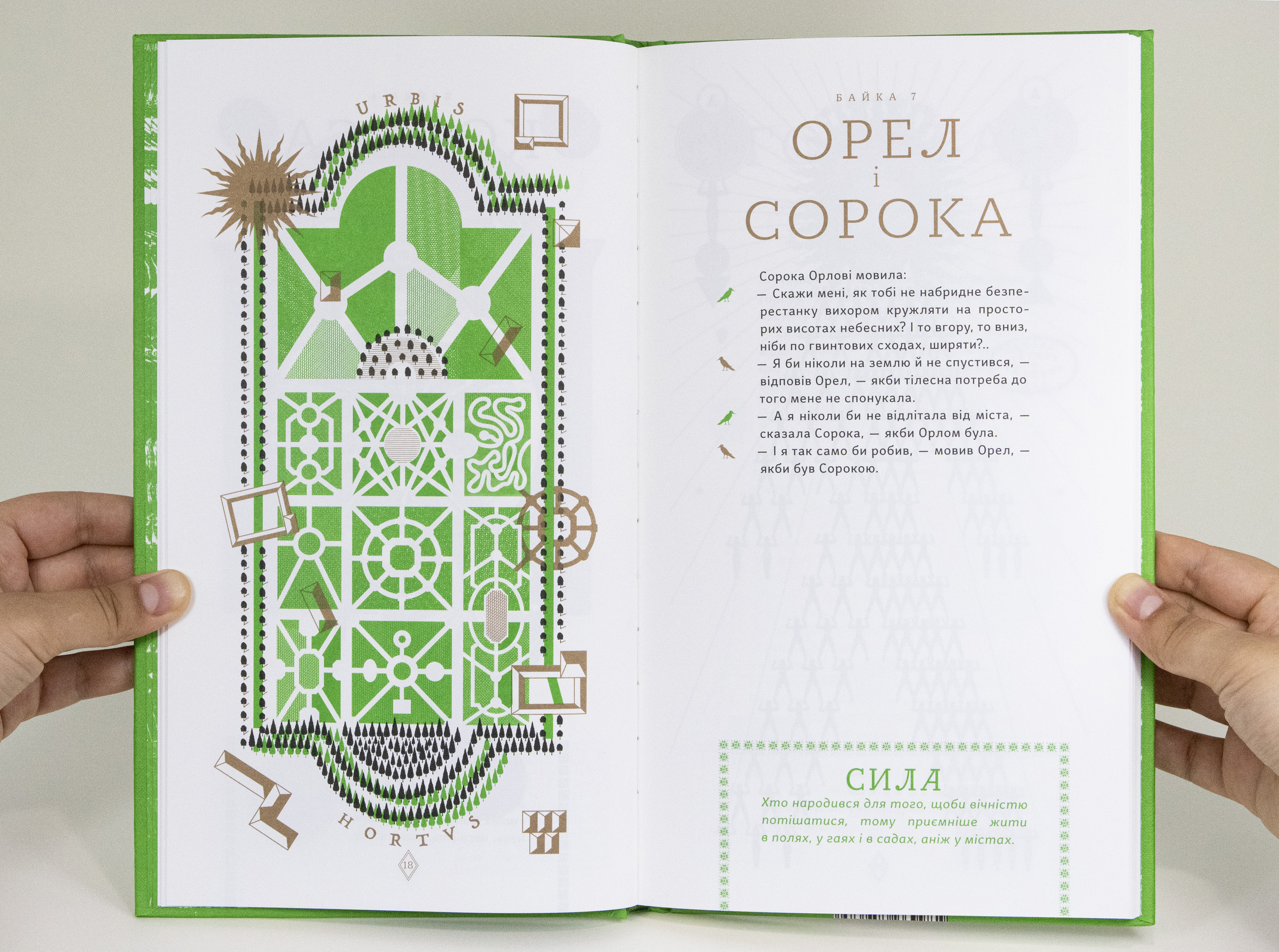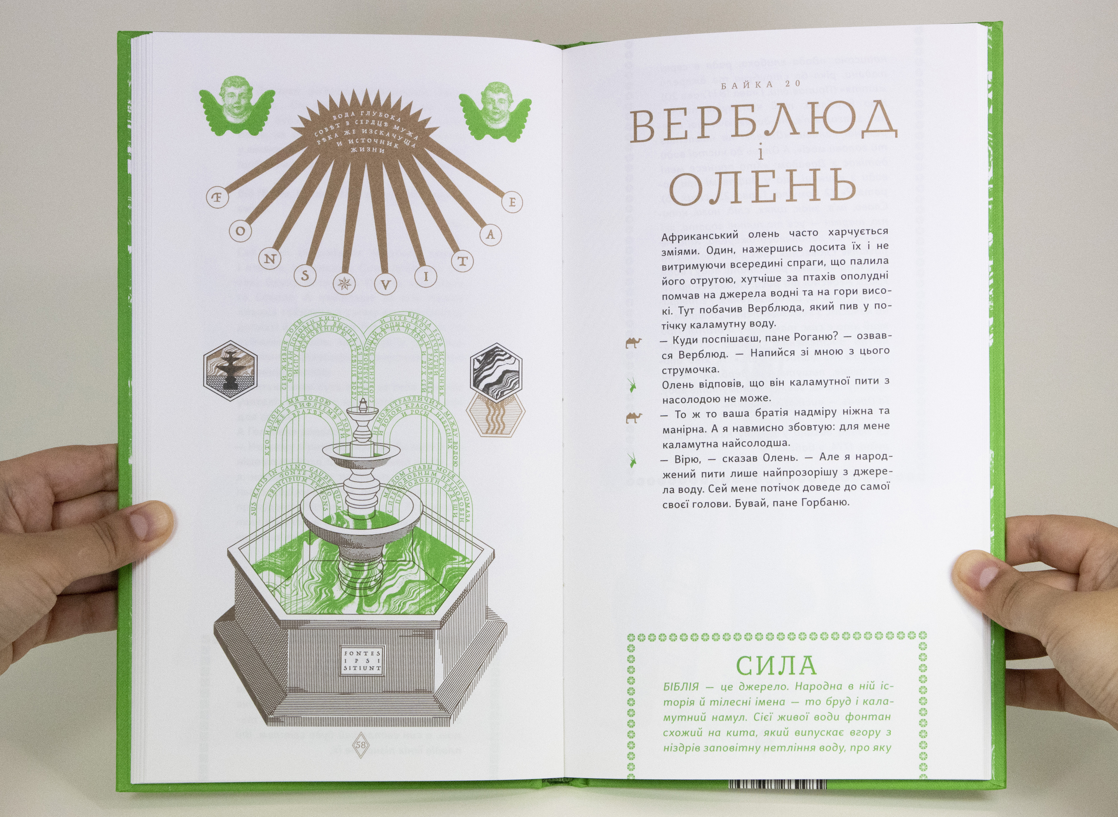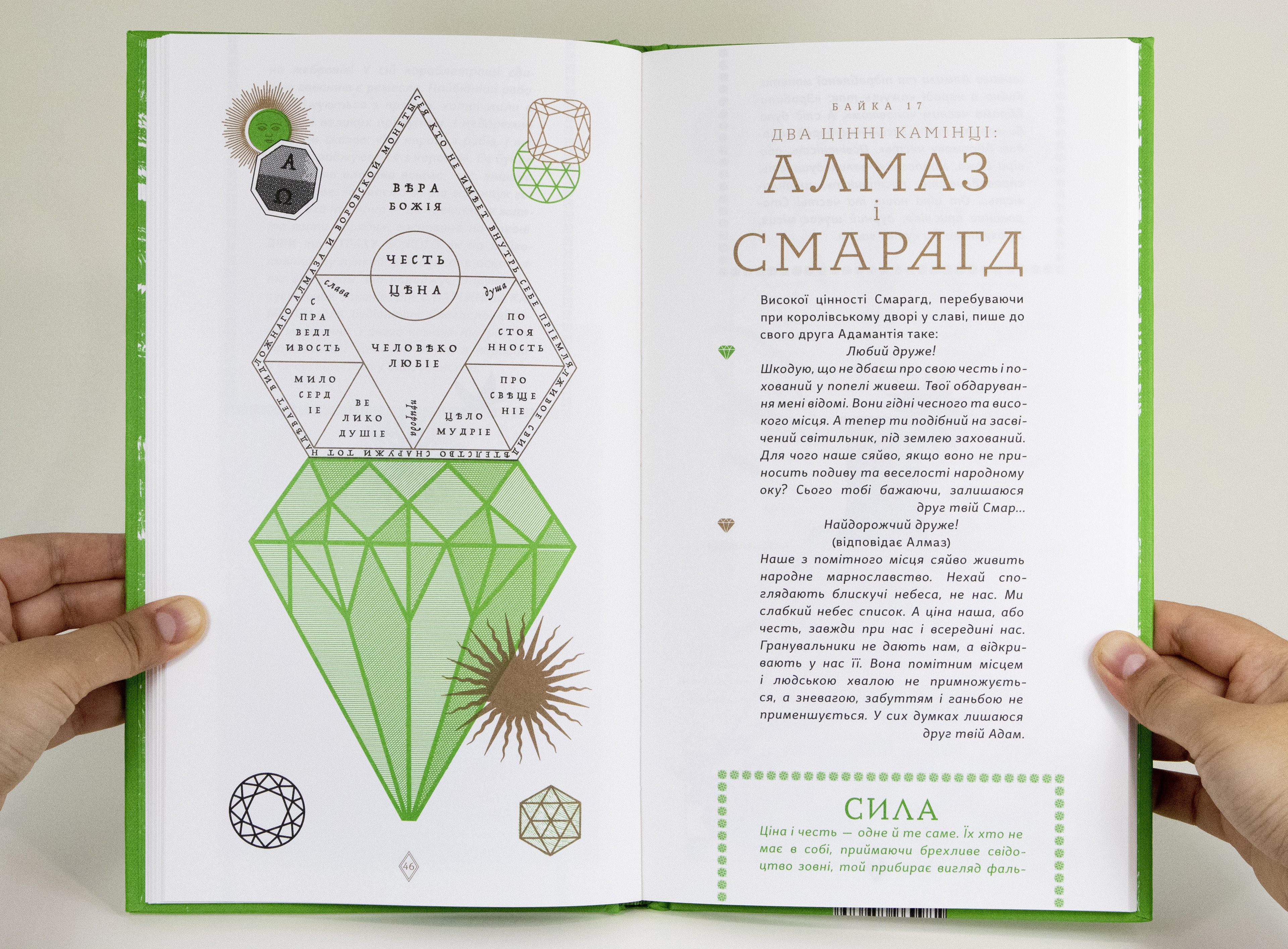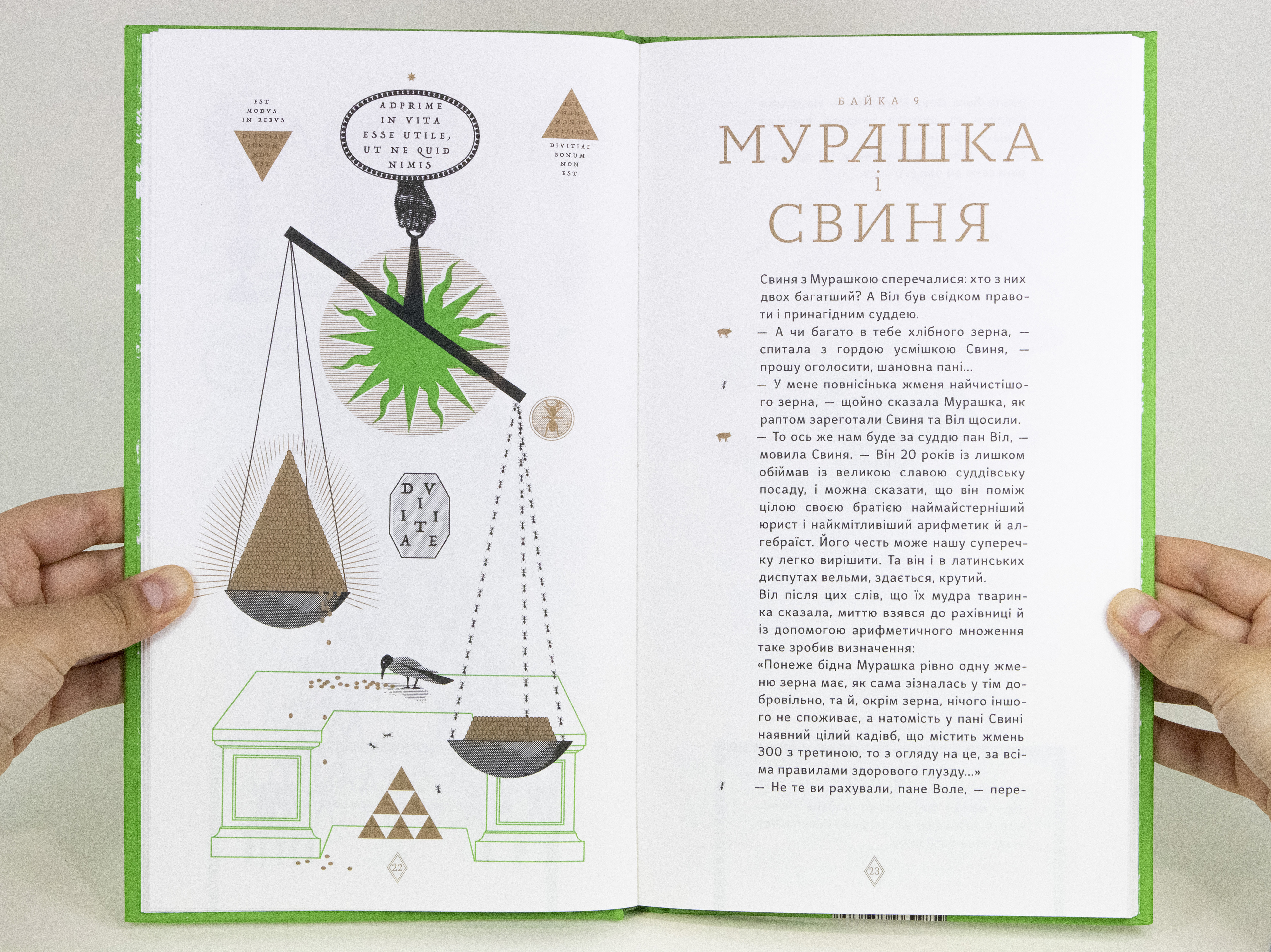 The book written by famous Ukrainian philosopher, writer and thinker of 18th century Hryhorii Skovoroda. 30 fables written in “Aesop’s language” tell about most important topics and teach about humanism, faith, honesty, love, justice. The illustrations for each fable are deeply rooted in baroque engravings aesthetic, biblical texts and ancient philosophy. Every illustration is like a visual rebus to be read and decoded by reader alongside with the texts.