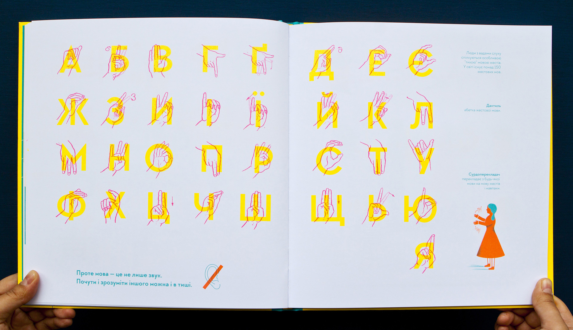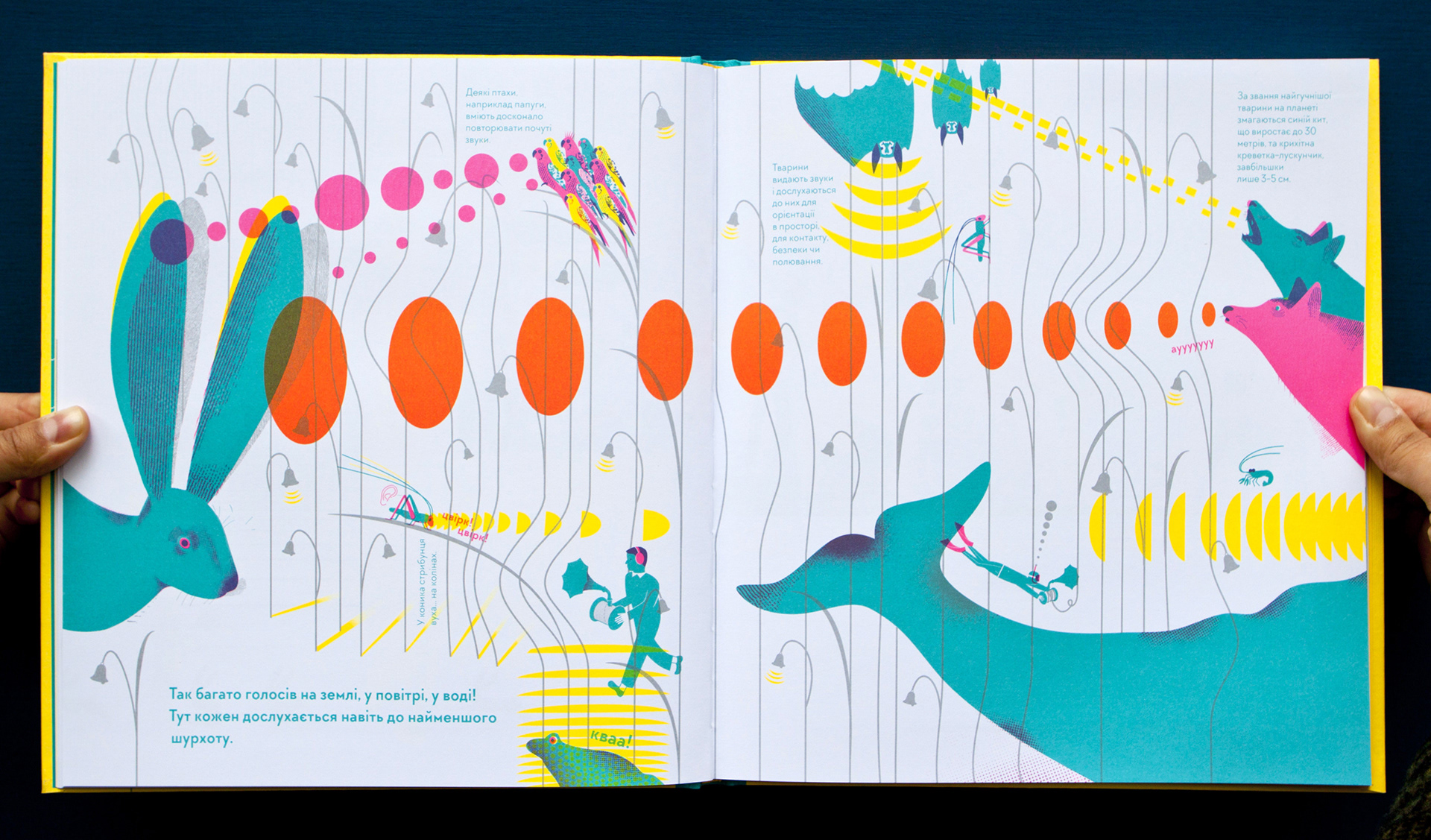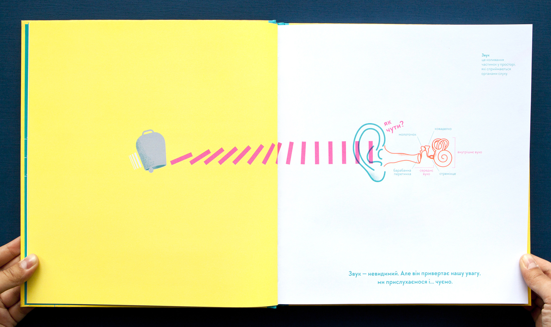 A nonfiction book about hearing and deafness, sound and silence. It is a first book from the project "I hear - I see - I feel the world"  about hearing and vision. This book is about how important it is to listen and hear each other. And understand even without words. Written and illustrated by Romana Romanyshyn and Andriy Lesiv, art studio Agrafka. Published by Old Lion Publishing House in 2017 in Lviv, Ukraine. Printed with 4 PANTONE colours.