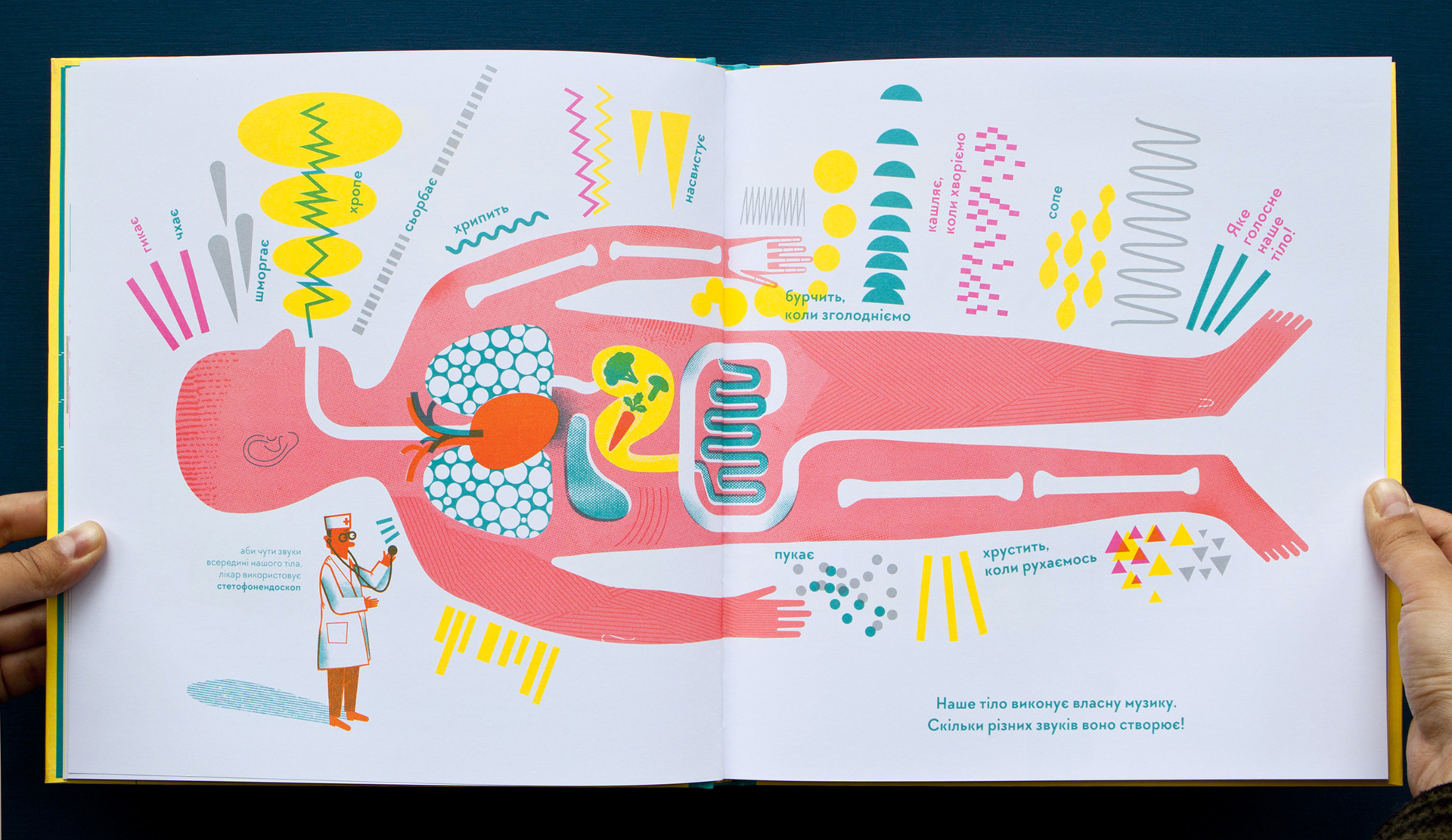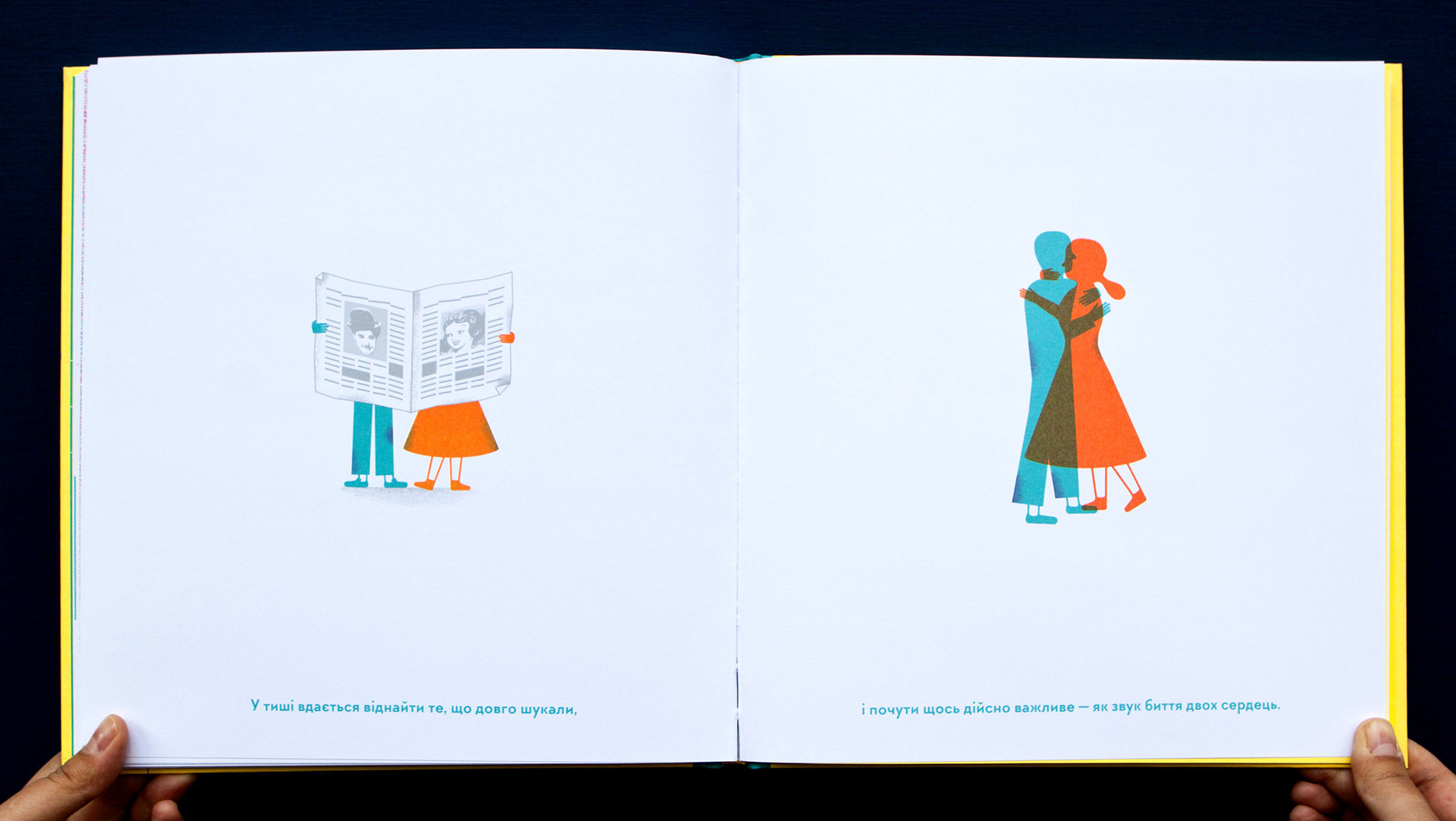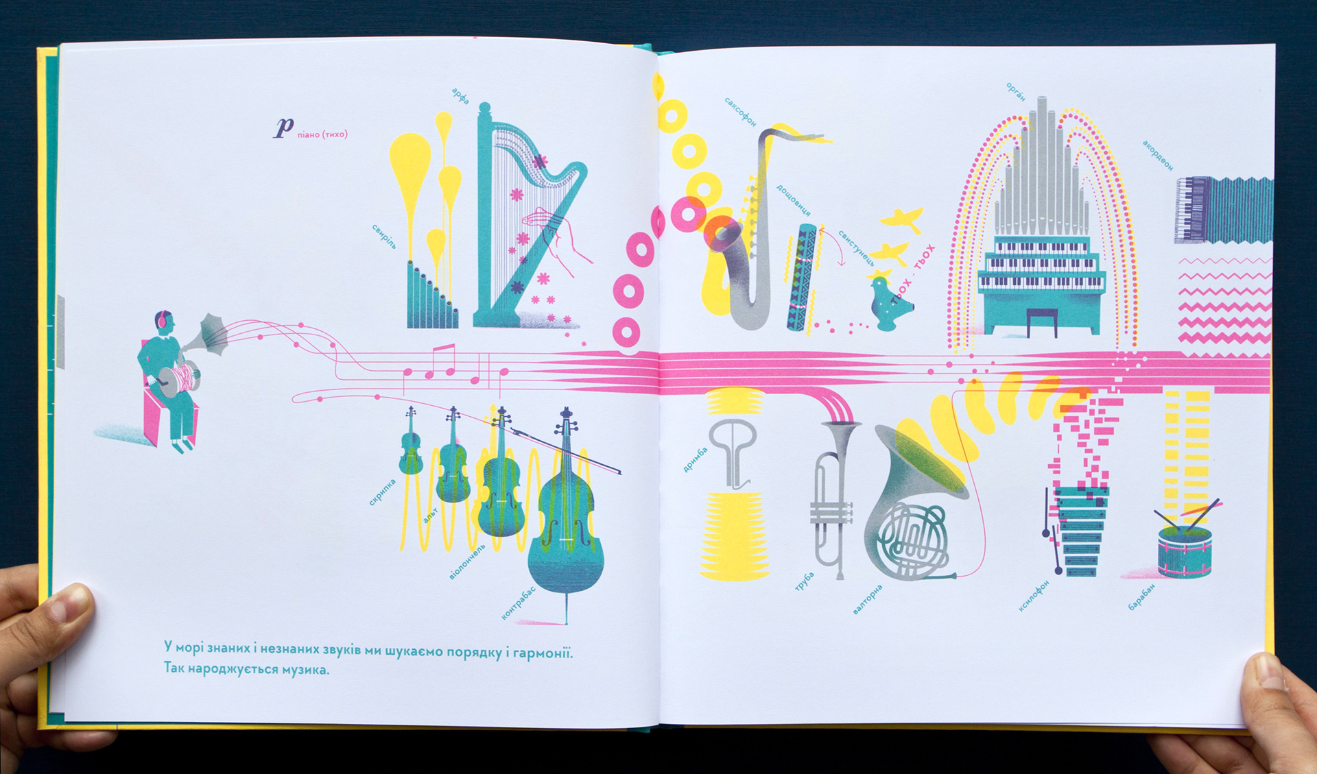 A nonfiction book about hearing and deafness, sound and silence. It is a first book from the project "I hear - I see - I feel the world"  about hearing and vision. This book is about how important it is to listen and hear each other. And understand even without words. Written and illustrated by Romana Romanyshyn and Andriy Lesiv, art studio Agrafka. Published by Old Lion Publishing House in 2017 in Lviv, Ukraine. Printed with 4 PANTONE colours.