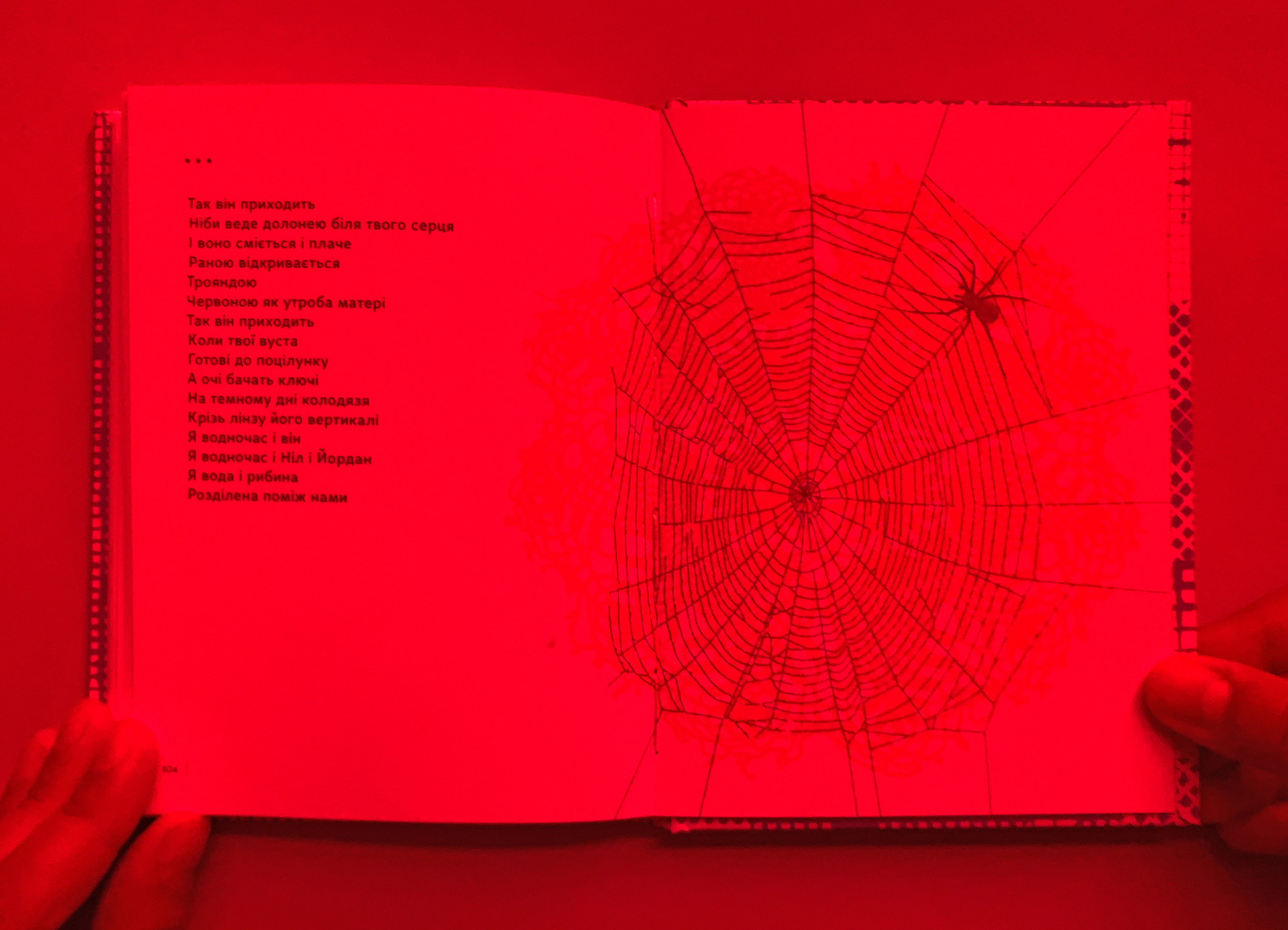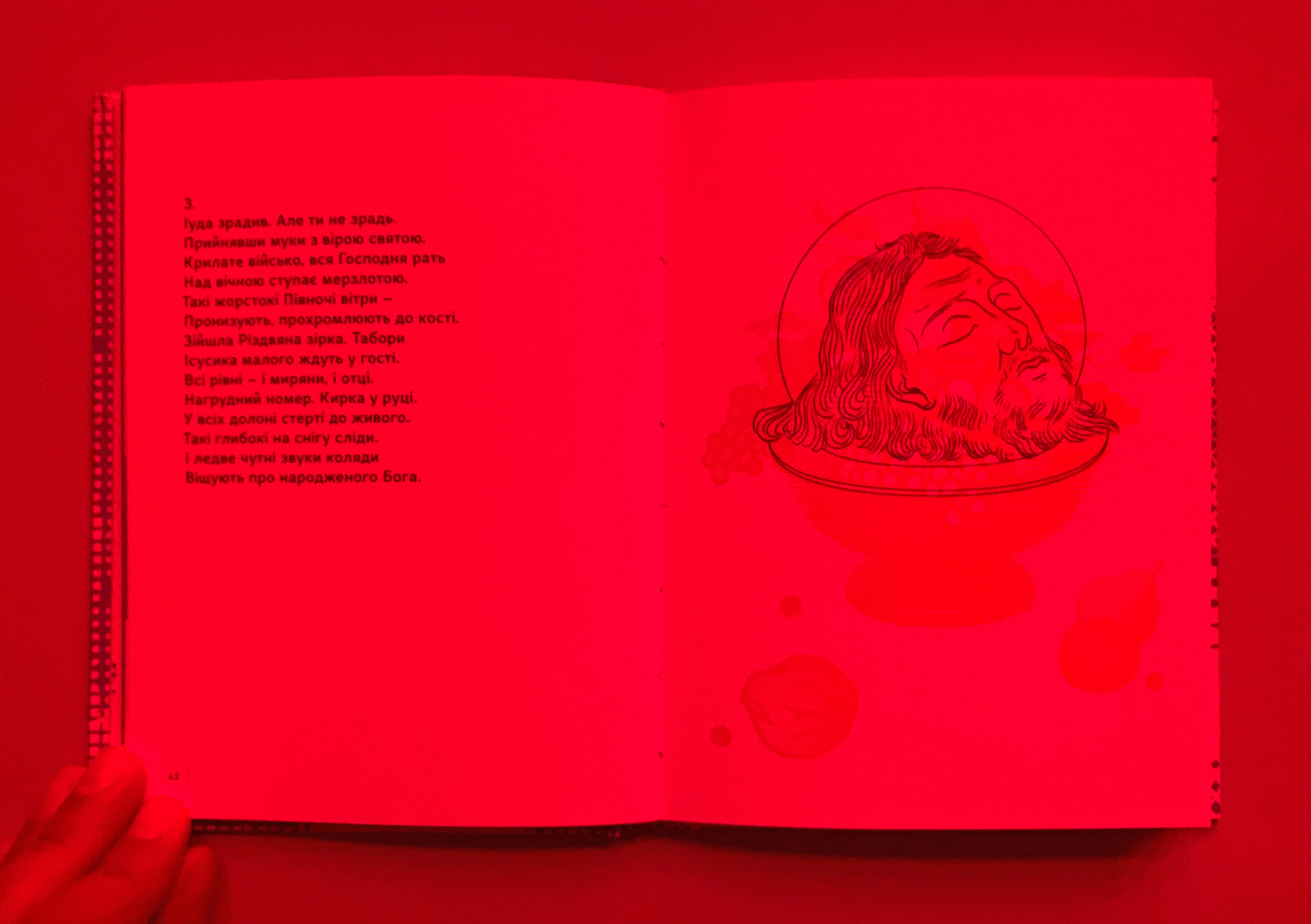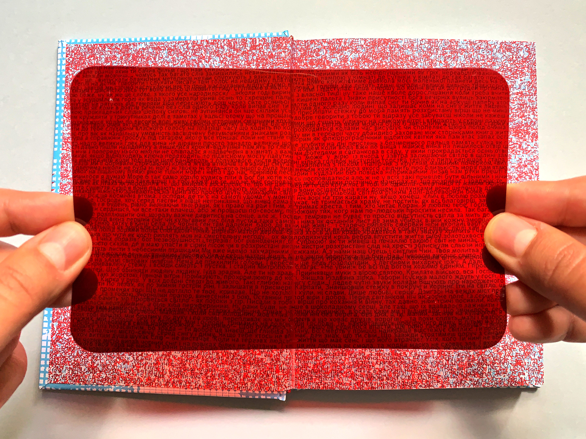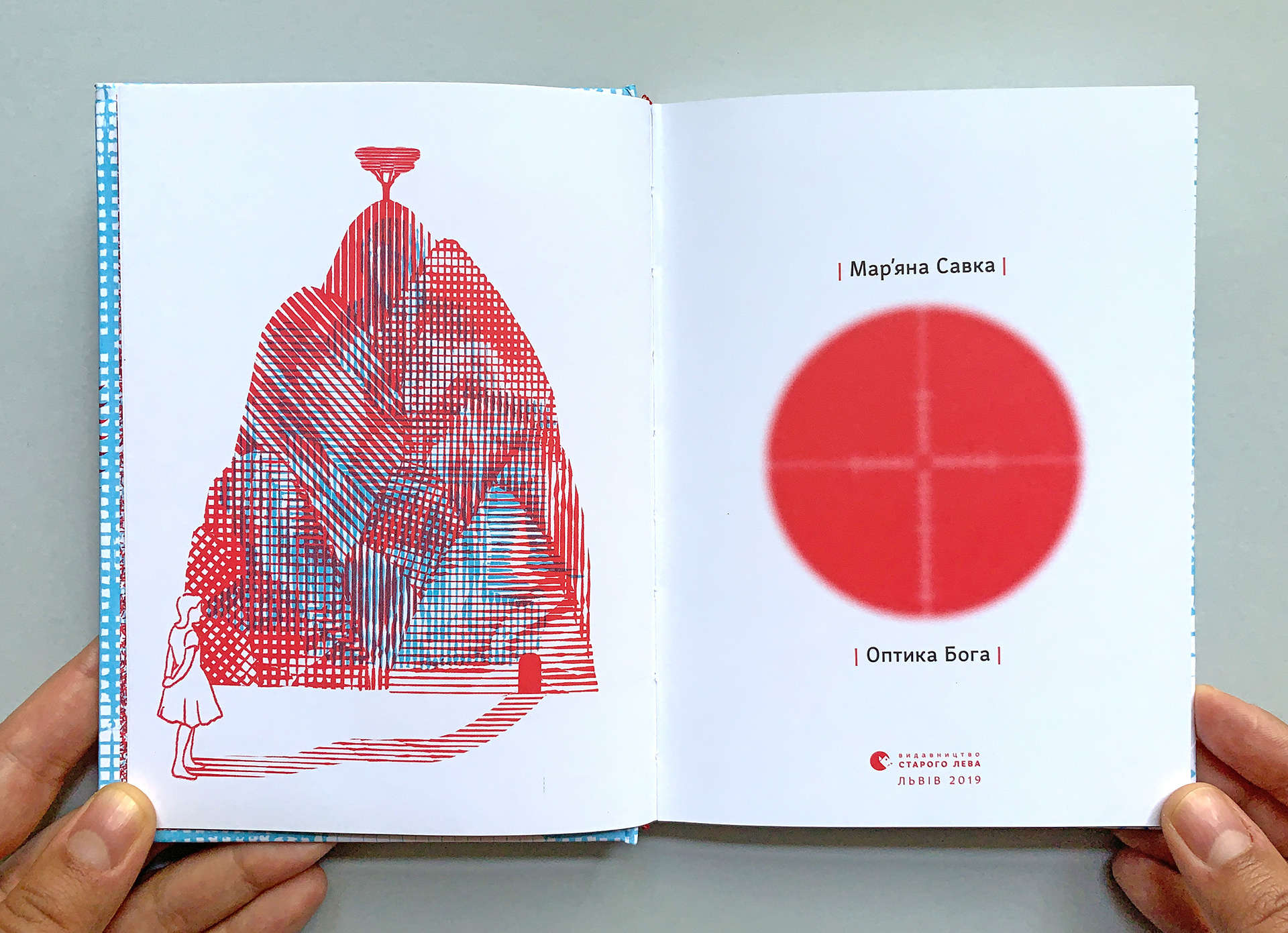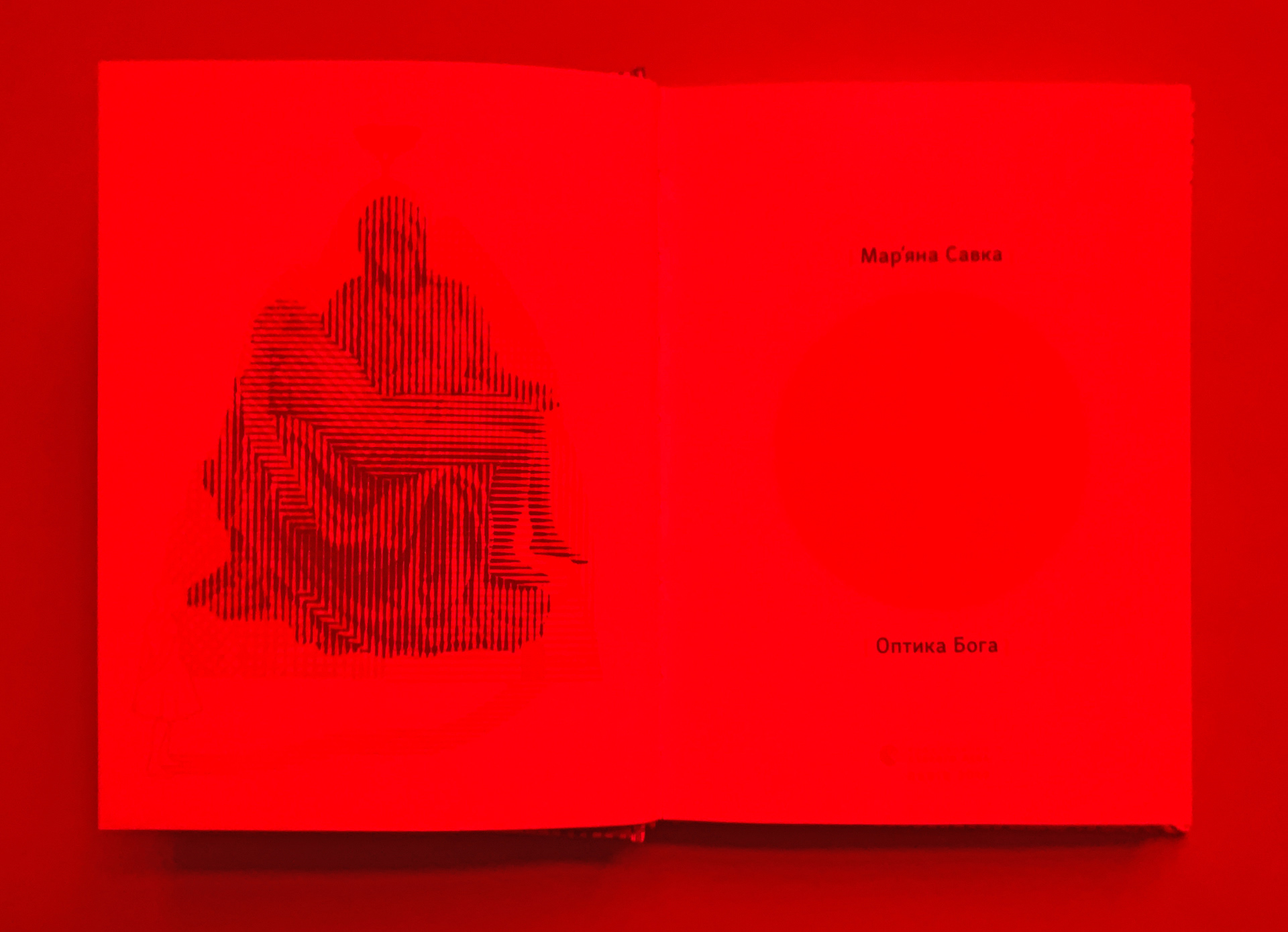 Optics of God – illustrated book of poetry by modern Ukrainian author Mariana Savka. Each illustration is printed with two colors – blue and red. Reader can look at the picture with a naked eye and through the red filter attached to the book, and the image will change.