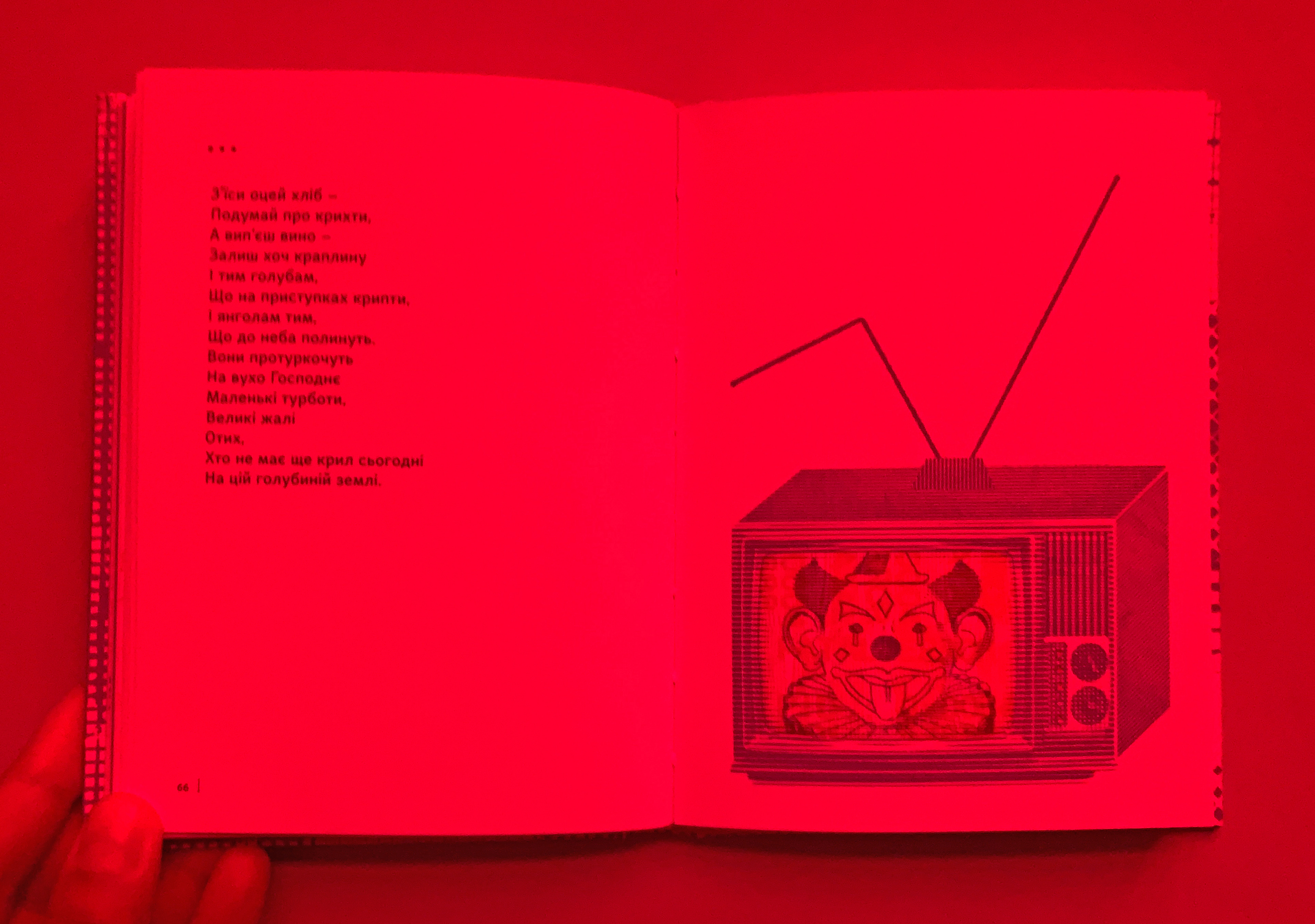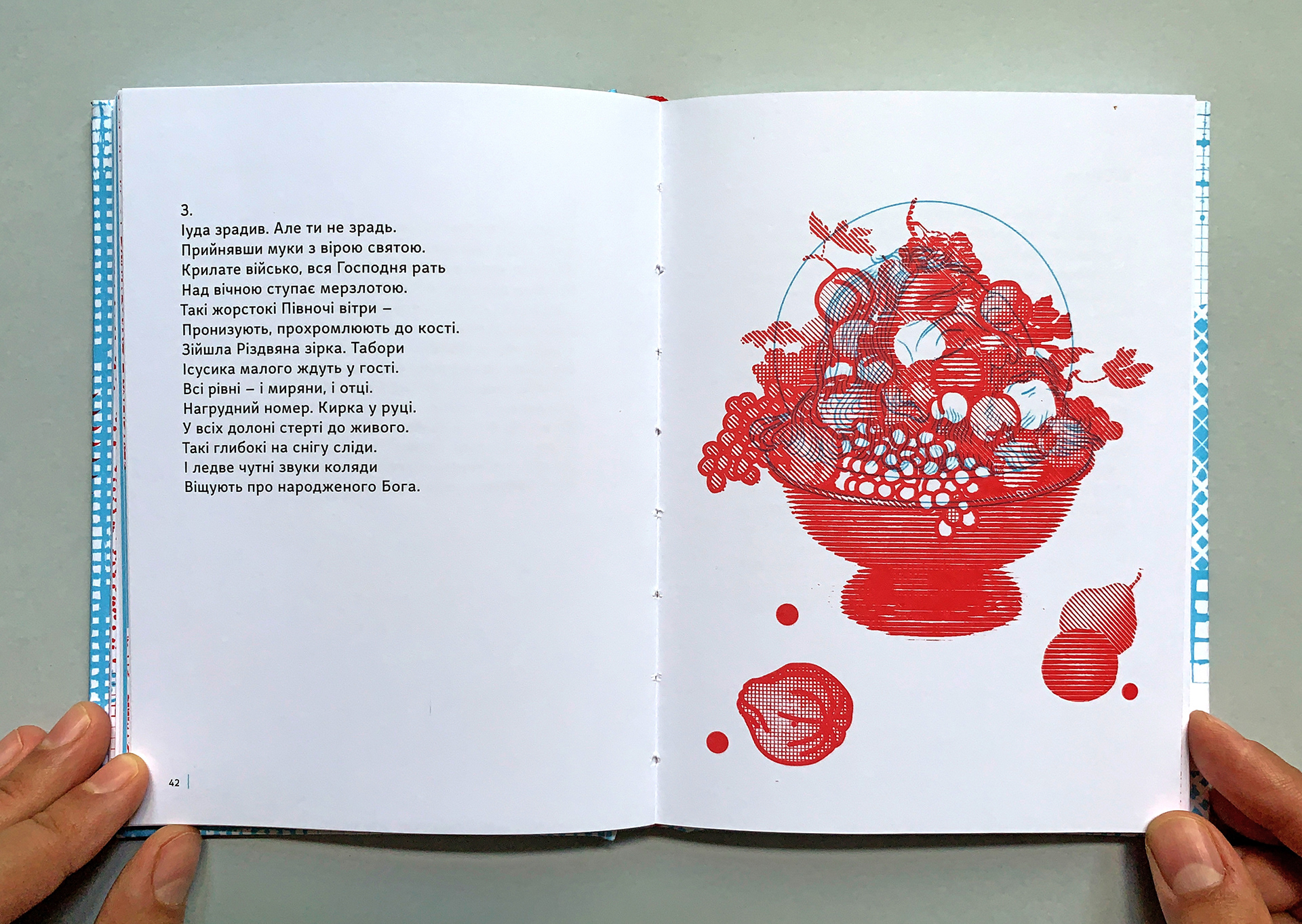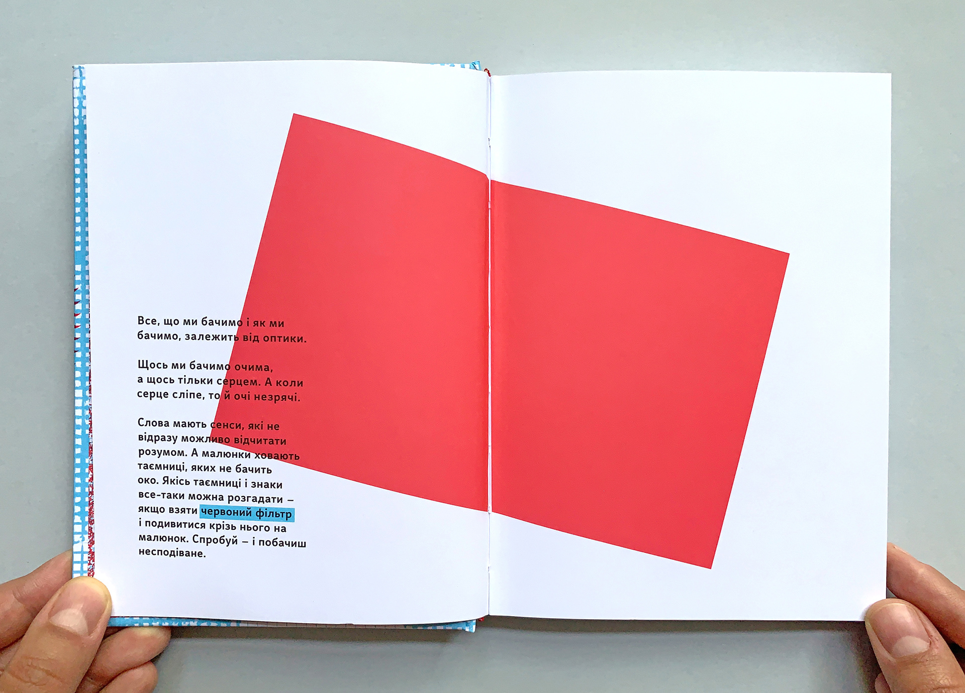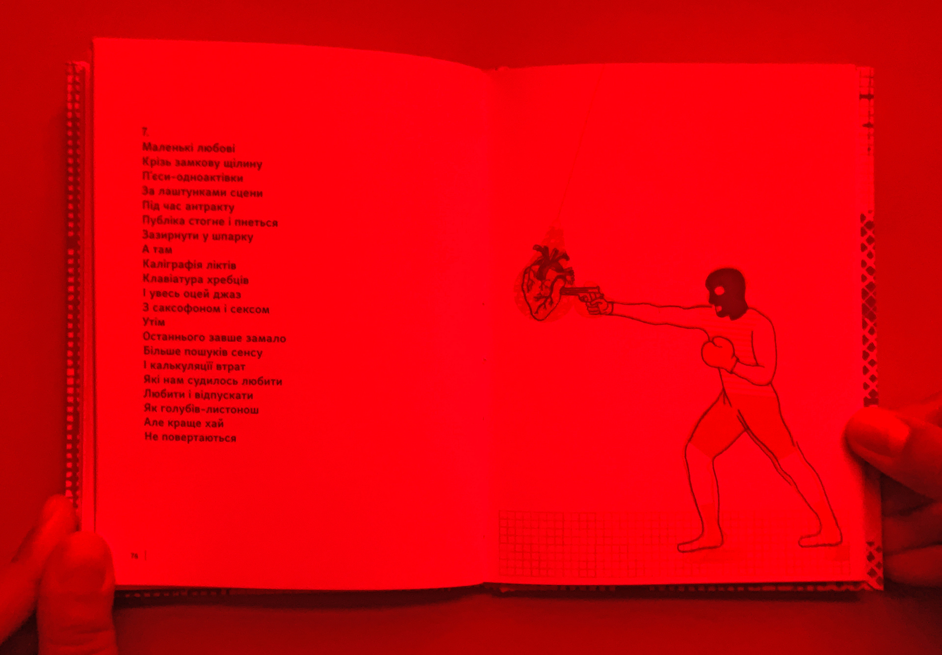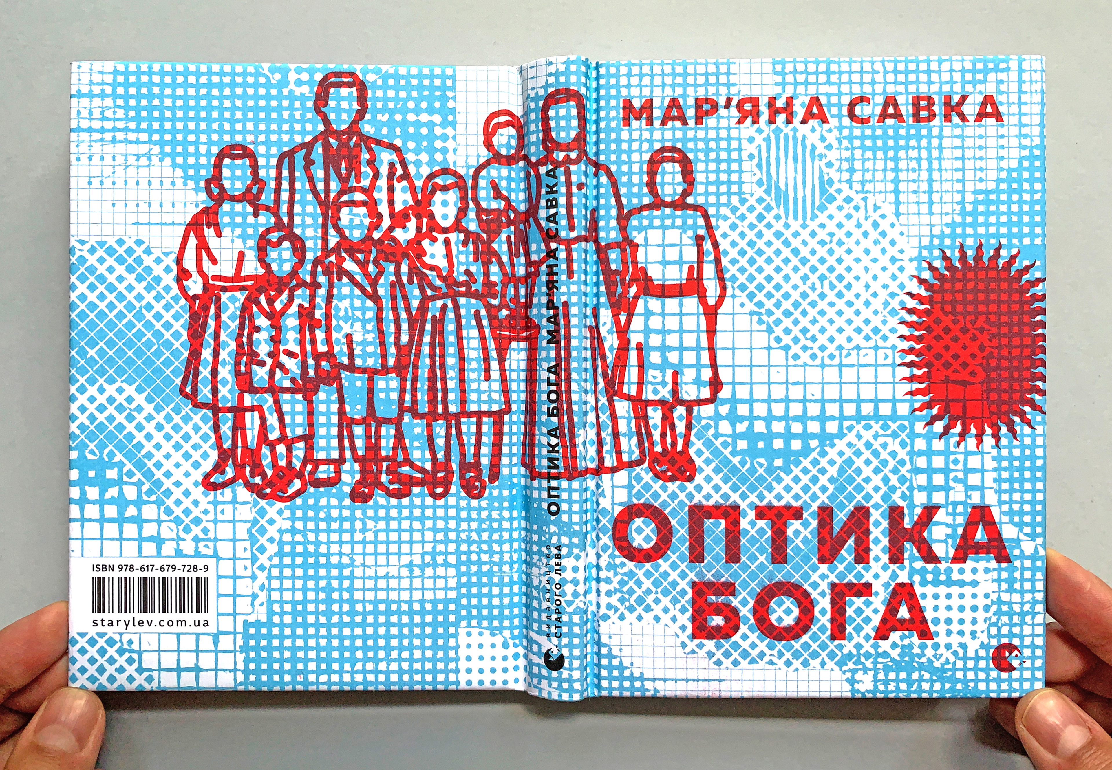 Optics of God – illustrated book of poetry by modern Ukrainian author Mariana Savka. Each illustration is printed with two colors – blue and red. Reader can look at the picture with a naked eye and through the red filter attached to the book, and the image will change.