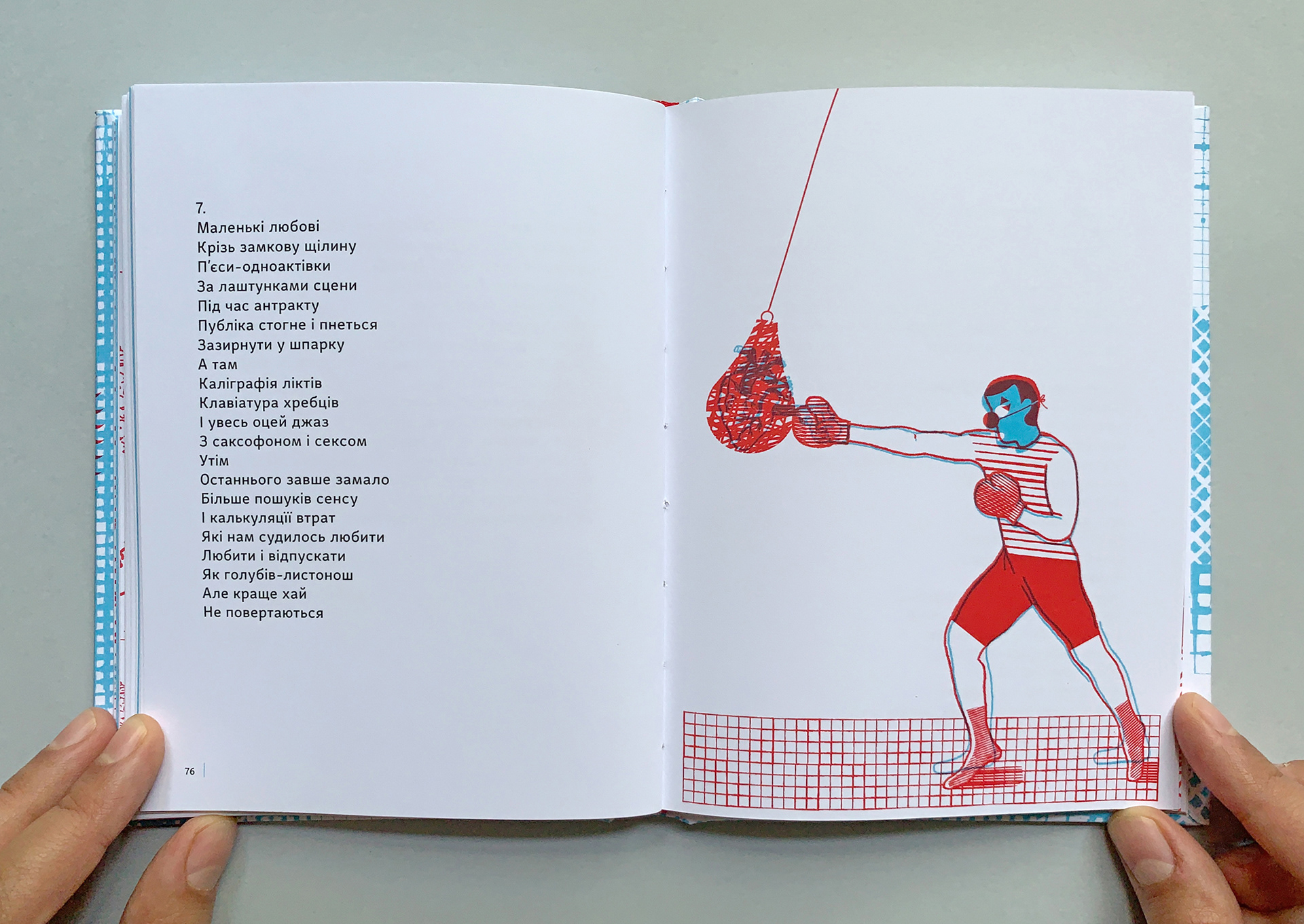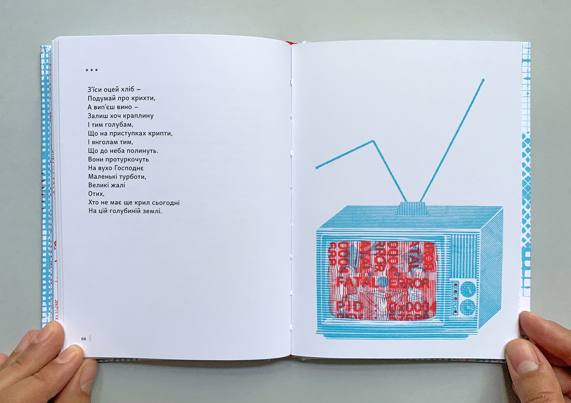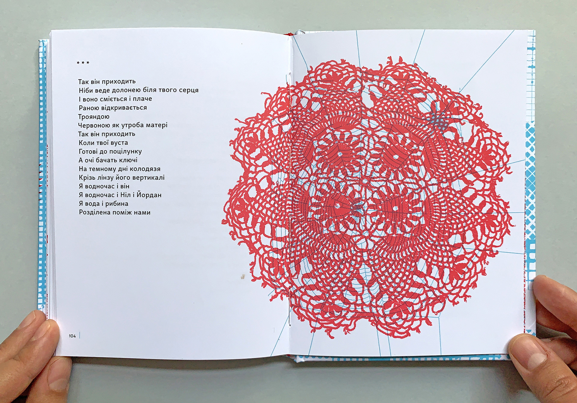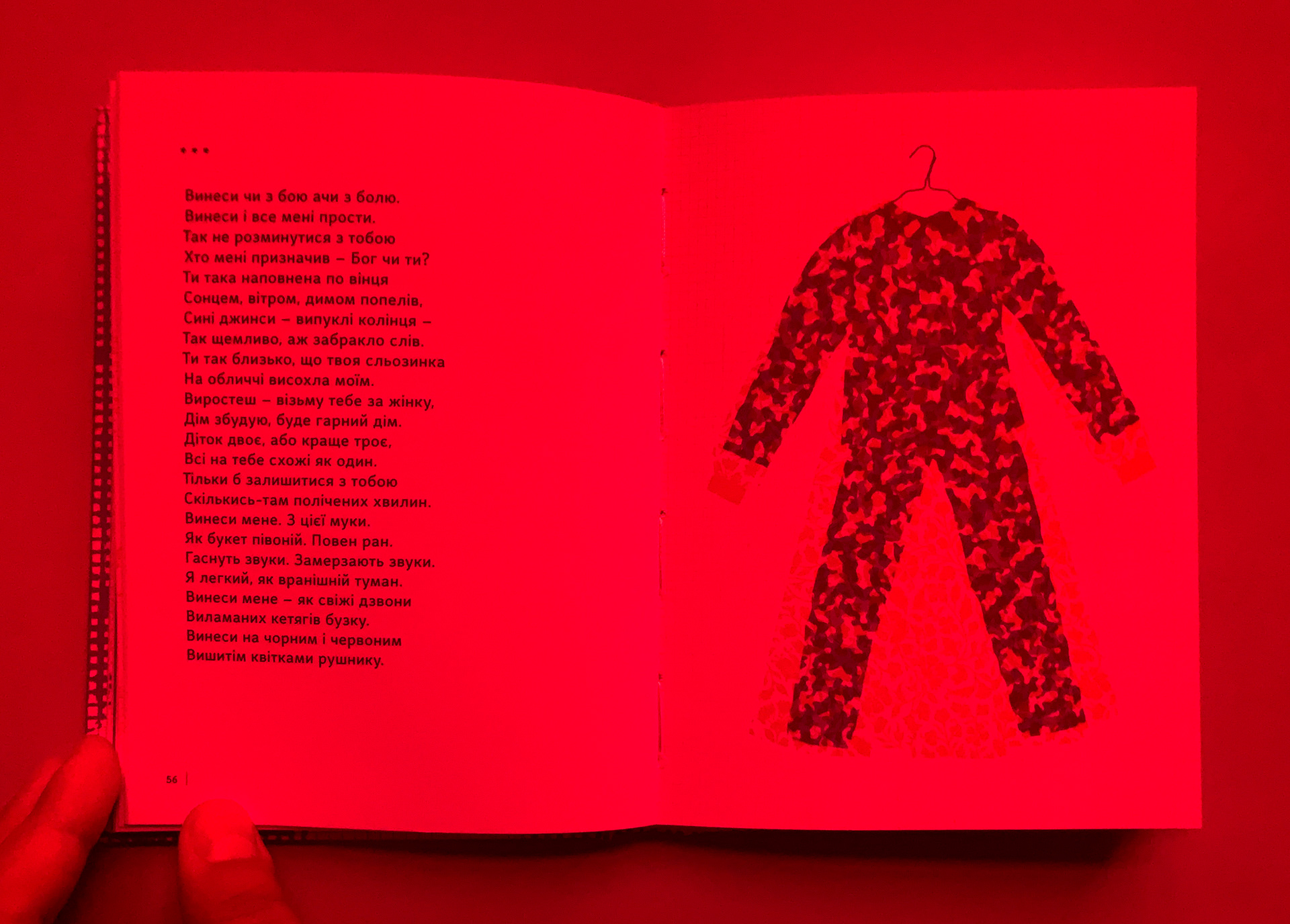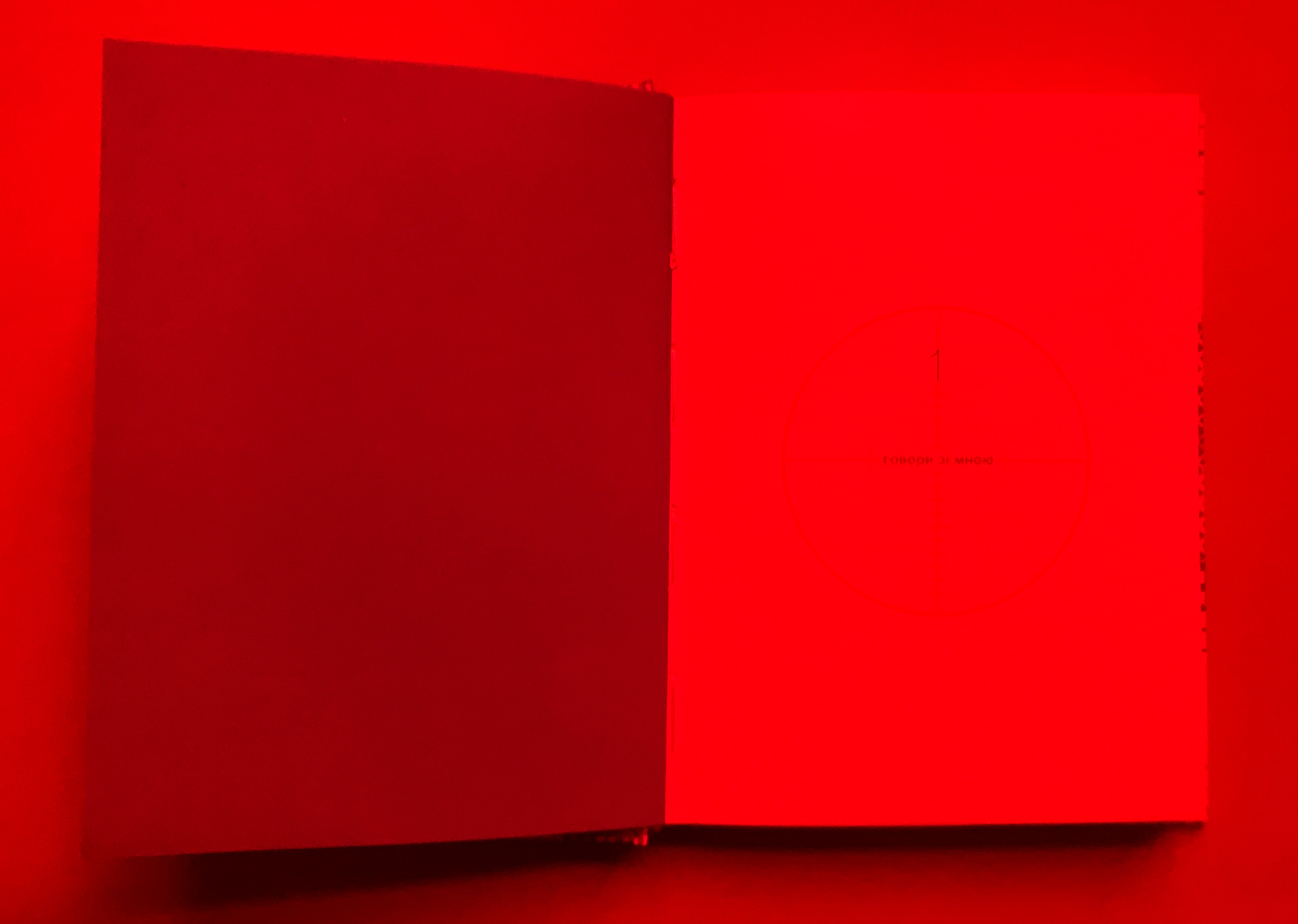 Optics of God – illustrated book of poetry by modern Ukrainian author Mariana Savka. Each illustration is printed with two colors – blue and red. Reader can look at the picture with a naked eye and through the red filter attached to the book, and the image will change.
