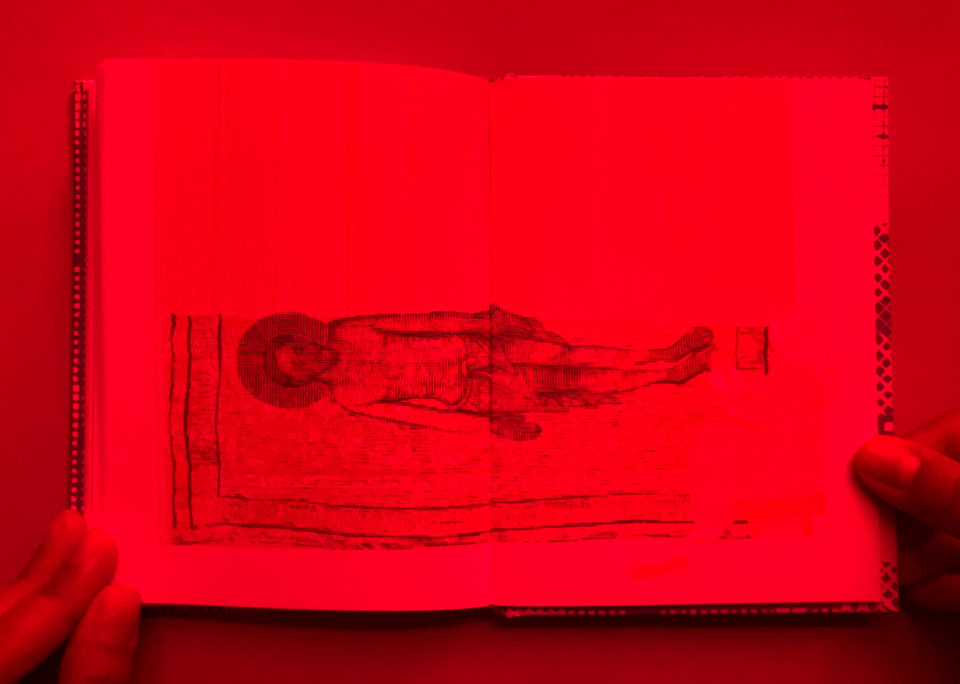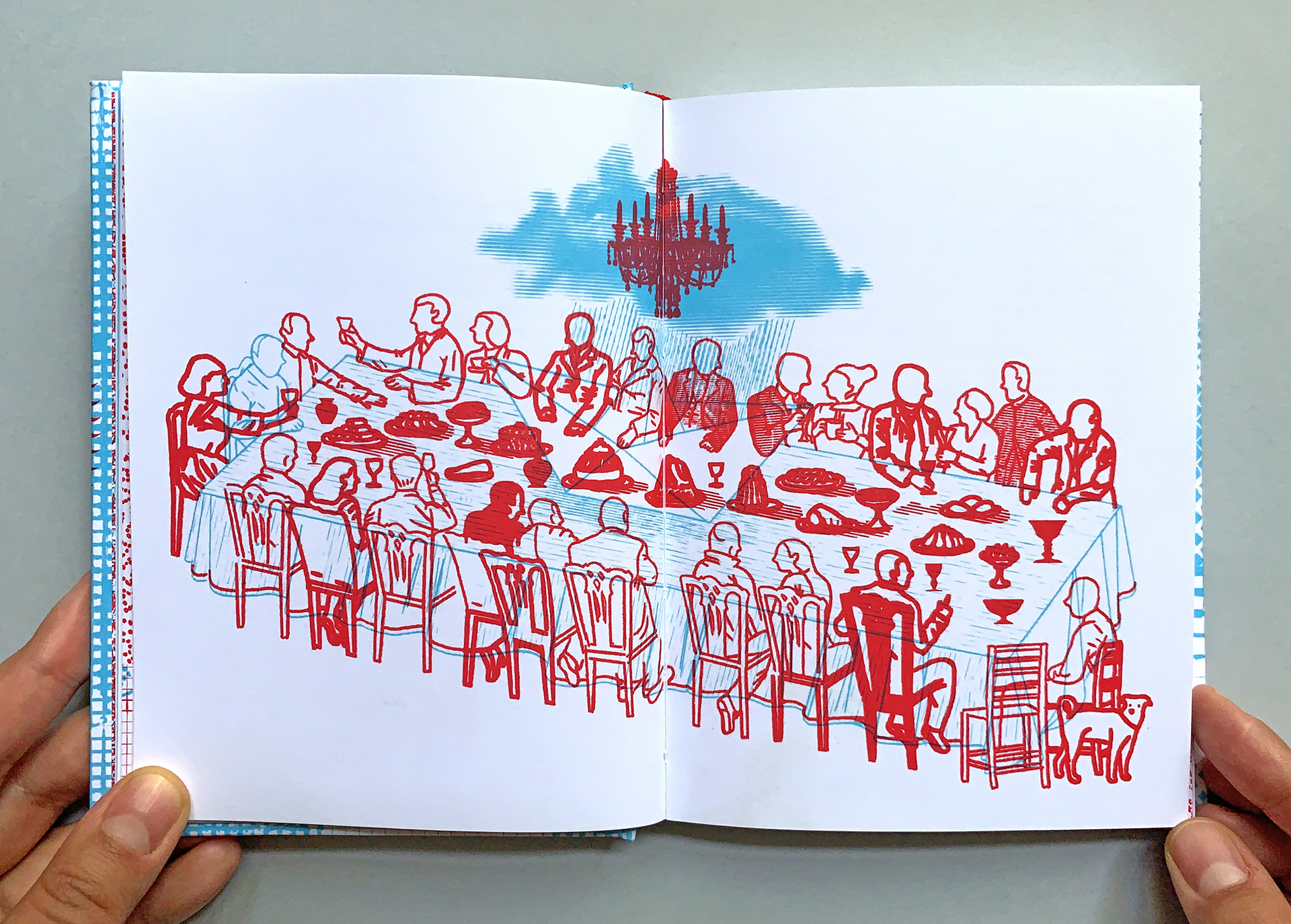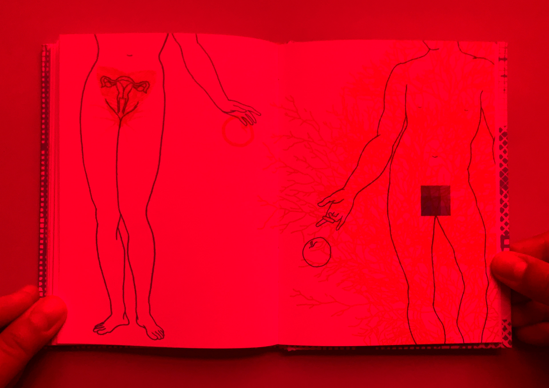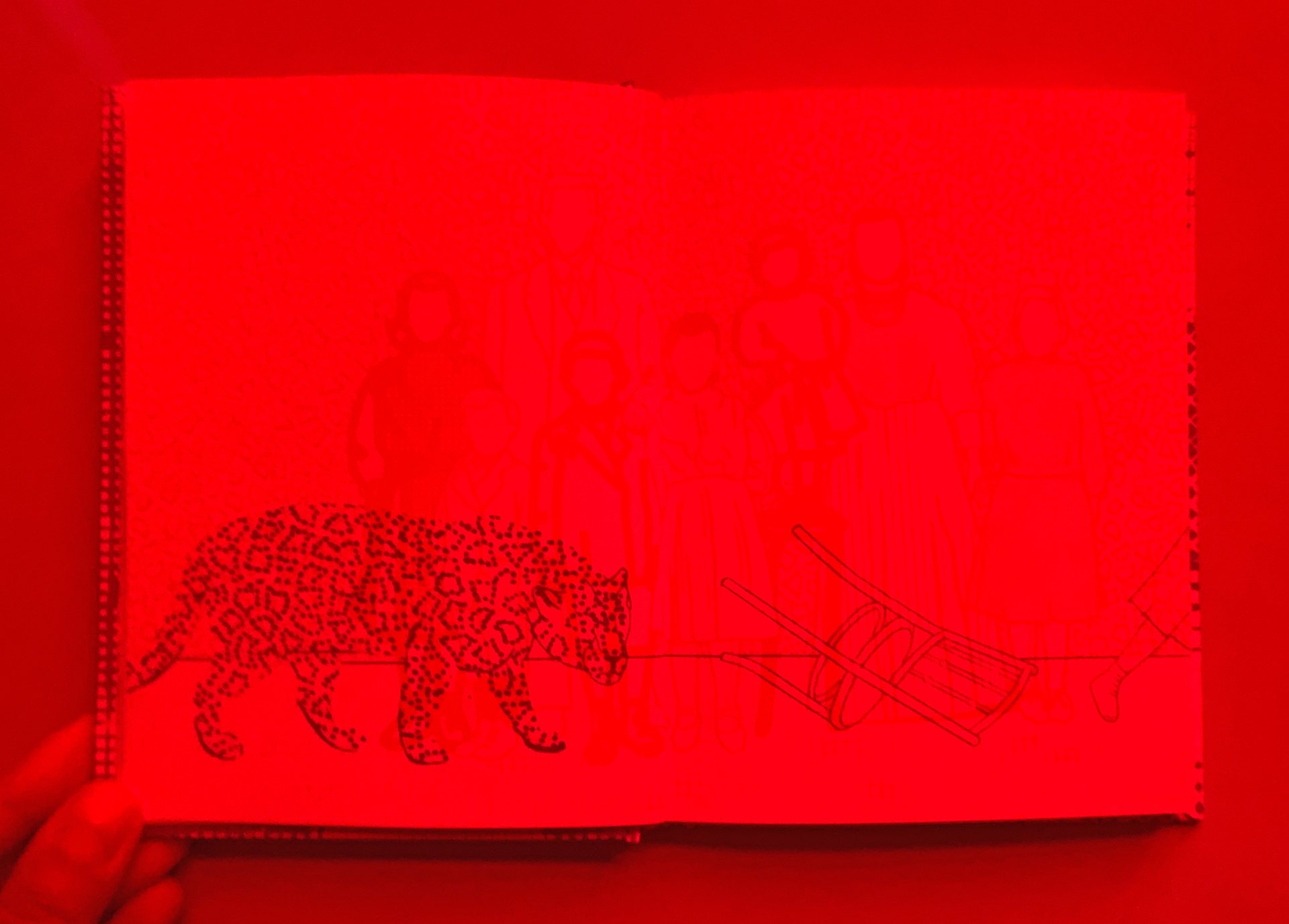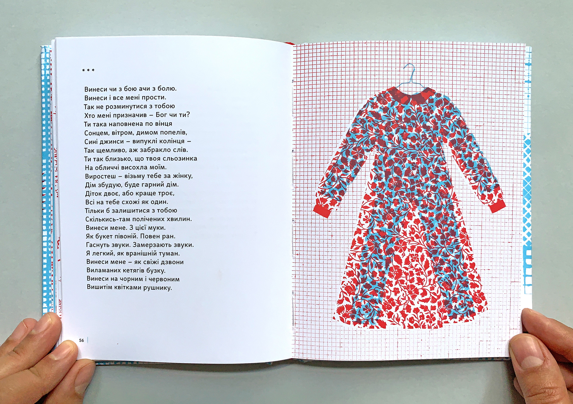 Optics of God – illustrated book of poetry by modern Ukrainian author Mariana Savka. Each illustration is printed with two colors – blue and red. Reader can look at the picture with a naked eye and through the red filter attached to the book, and the image will change.