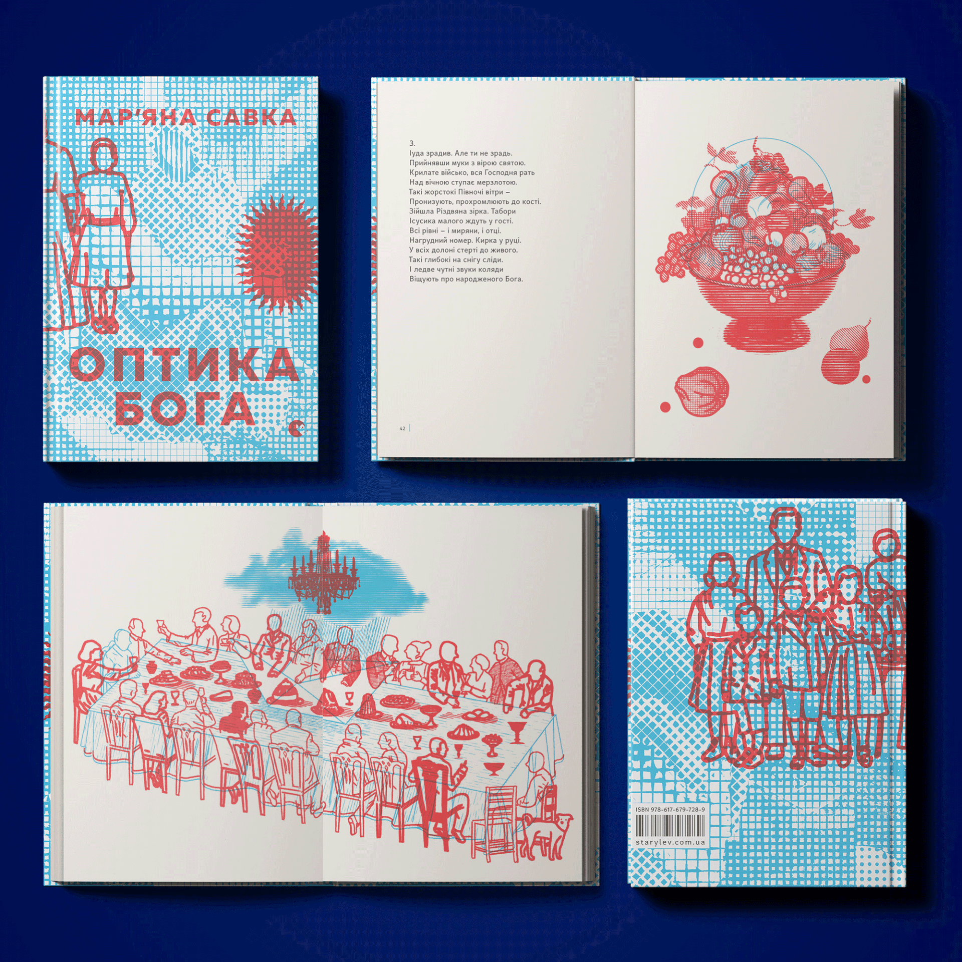 В час, коли реальність все більше сприймається через фільтри інстаґраму, коли первинне зображення замивається, деформується, мутує і стає значно «кращим» за оригінал складно зберігати чіткість бачення. Оптика сприйняття змінюється і дуже непросто відділити справжнє від підробки, розгледіти щось крізь візуальний шум. А що як мати власний фільтр, крізь який все видно чіткіше? Червоний фільтр у книзі «Оптика Бога» проявляє образи і символи, подібно до проявлення фотографій у червоному світлі. Щось нове проявляється і оприявнюється. Отак розглядаючи книжку крізь цей фільтр, ми ніби дивимося крізь закопчене скельце на затемнення сонця. Червоно-бакитні ілюстрації, де червоні лінії, як судини мережать сторінку, створюючи ілюзію. Лише фільтр відсікає зайве, дозволяє подивитися крізь поверхню і ми чітко бачимо інший шар – блакитний. В ілюстраціях до книги Мар’яни ми працюємо з поняттям ілюзії та правди їй на противагу. Ми досліджуємо ці обидві сторони медалі, що творять одне ціле – мирне життя і насильство, щастя і самотність, любов і ненависть. Ми також розкриваємо біблійні сюжети і їх дуалізм – життя і смерть, добро і зло. І звісно ж ми не залишаємося осторонь нашого сьогодення - в ілюстраціях, як і у віршах Мар’яни, в оптиці опиняється Майдан, війна і телевізор, як символ того, що якраз формує оптику більшості. Складно усвідомити що як добрі, так і погані вчинки можуть походити від одних і тих самих людей. Сьогодні хтось радіє народженню нового життя, а назавтра йде відбирати життя іншого; сьогодні вигукує «осанна», а за кілька днів – «розіпни його». Оптика Бога – це і є та здатність бачити життя немов би в двох шарах водночас. І лише оптика Бога дозволяє розшарувати цю дійсність на окремі кольори і зазирнути за рамки, побачити ширшу картину. Книга «Оптика Бога» провадить читача як паломника, дорогою випробувань і самоусвідомлення. І лише Бог знає що там ще попереду.