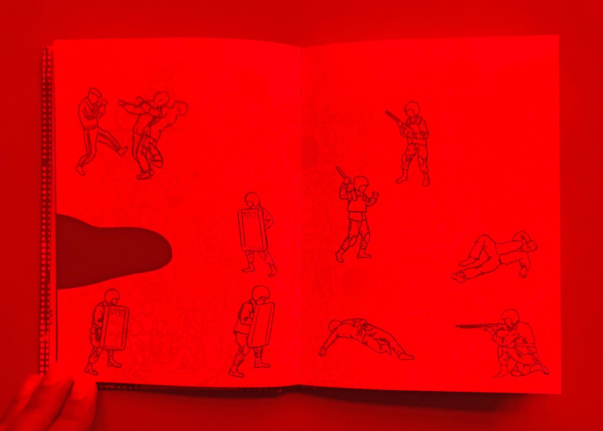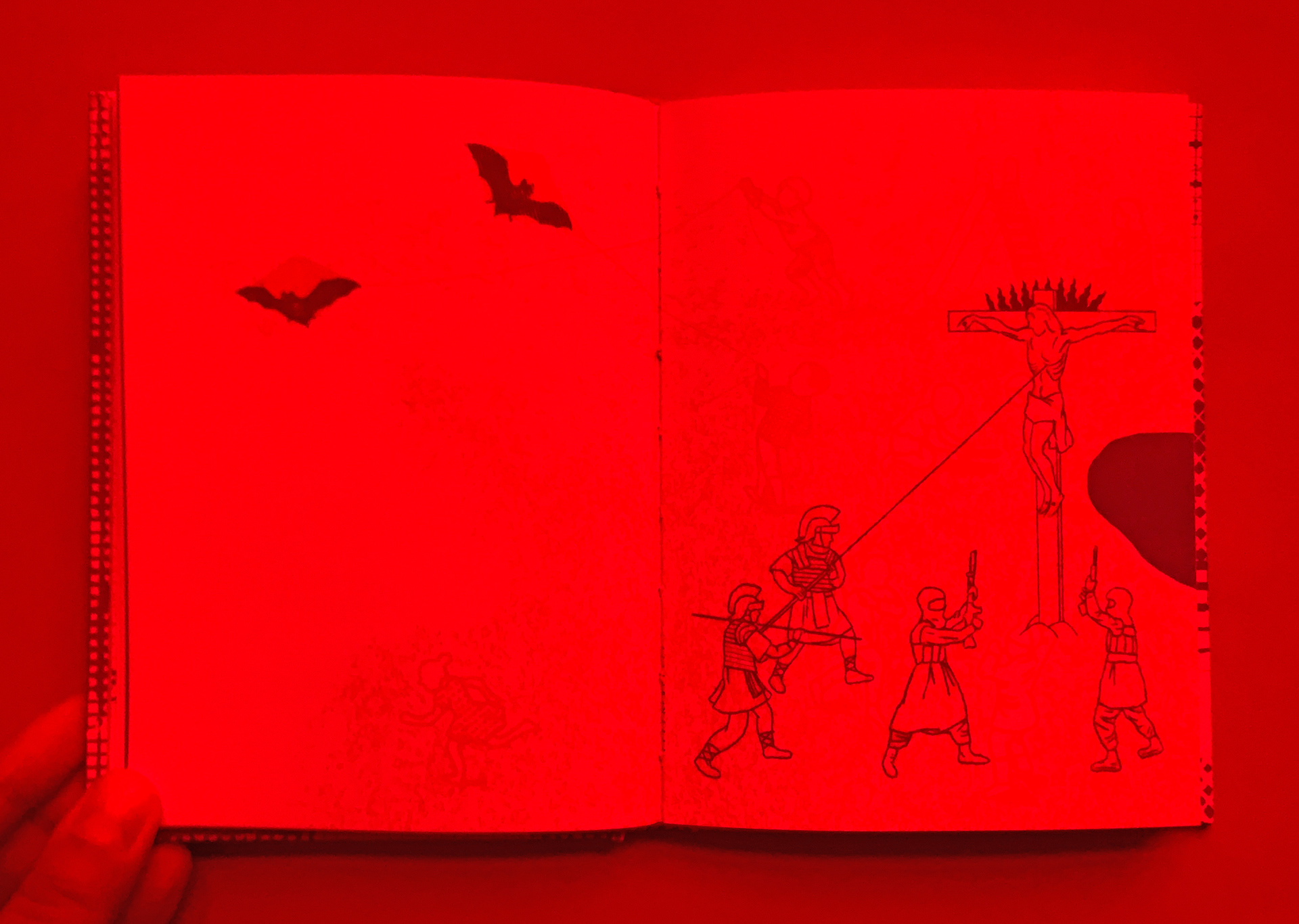 At a time when reality is increasingly perceived through Instagram filters, when the original image is washed away, distorted, mutated, it becomes difficult to maintain the clarity of vision. The optics of perception have changed, and it is not easy to separate the real from the fake, to see clearly through the visual noise. And what if you could have your own filter through which everything can be seen clearly? The red filter in the book "Optics of God" shows hidden images and symbols, like the photography processing in darkroom’s red light. Something new is being revealed. So, as we look through the book using this filter, it is like we are looking through a dark glass at the sun eclipse. Red-blue illustrations where the lines are like vanes. Only the filter cuts off the extra, allows you to look behind the surface and we clearly see another layer. In the illustrations for this book we work with the concept of illusion and truth as opposed to it. We explore these two sides of the coin that create one whole – peaceful life and violence, happiness and loneliness, love and hate. We also reveal the biblical subjects and their dualism – life and death, good and evil. And of course, we do not stay out of today – in illustrations optics appear to be civil protests and war. And television, as a symbol of what precisely shapes the optics of the many people. It is difficult to realize that both good and bad deeds can be done by the same people. The optics of God are the ability to see life in two layers at the same time. And only the optics of God allow us to divide this reality into separate colors and look beyond, to see the bigger picture. The book "Optics of God" guides the reader as a pilgrim, a road of trials and self-awareness. And only God knows what lies ahead.